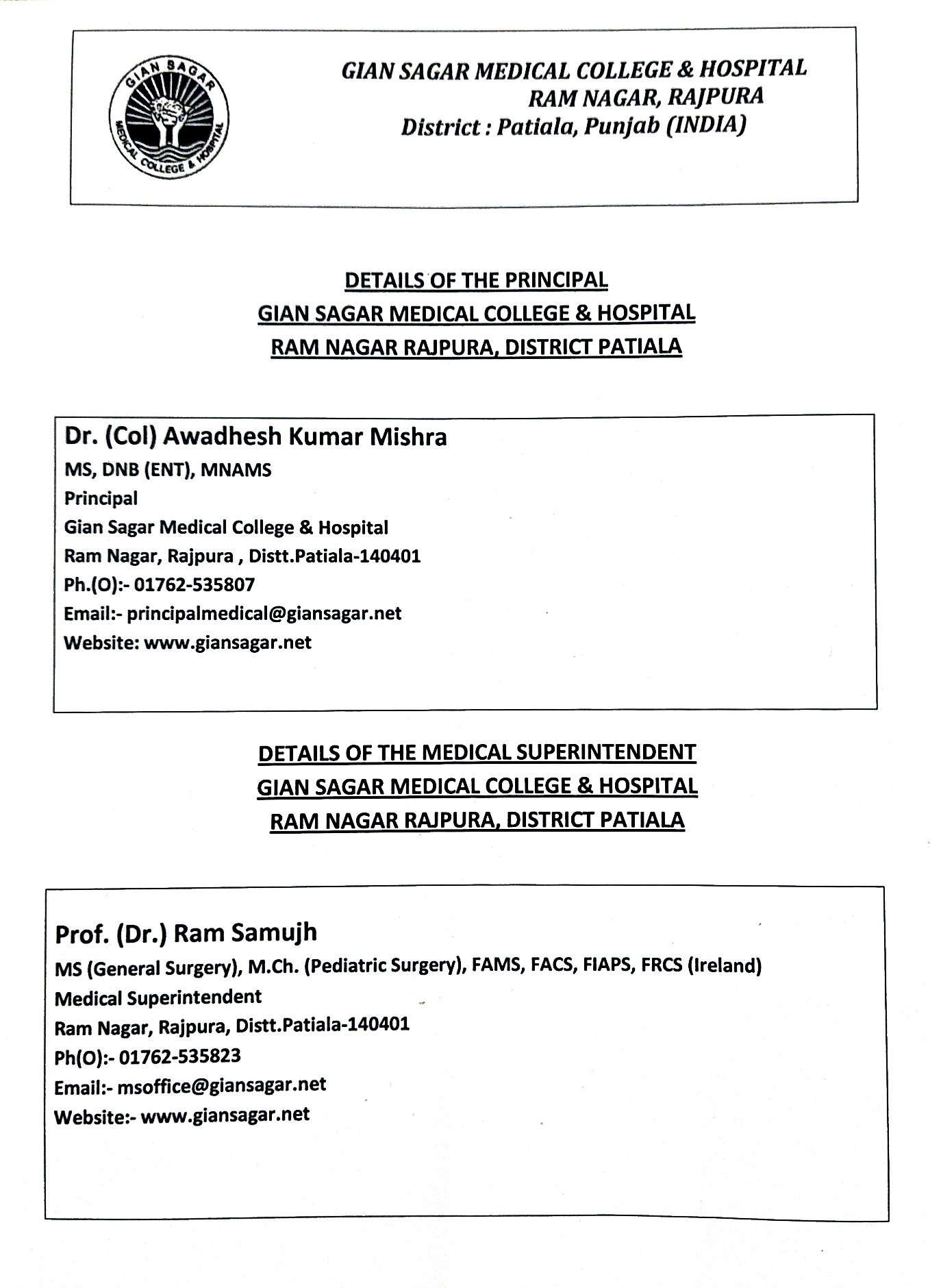 Gian Sagar Medical College Ramnagar, Rajpura, Patiala (Pb) 140401