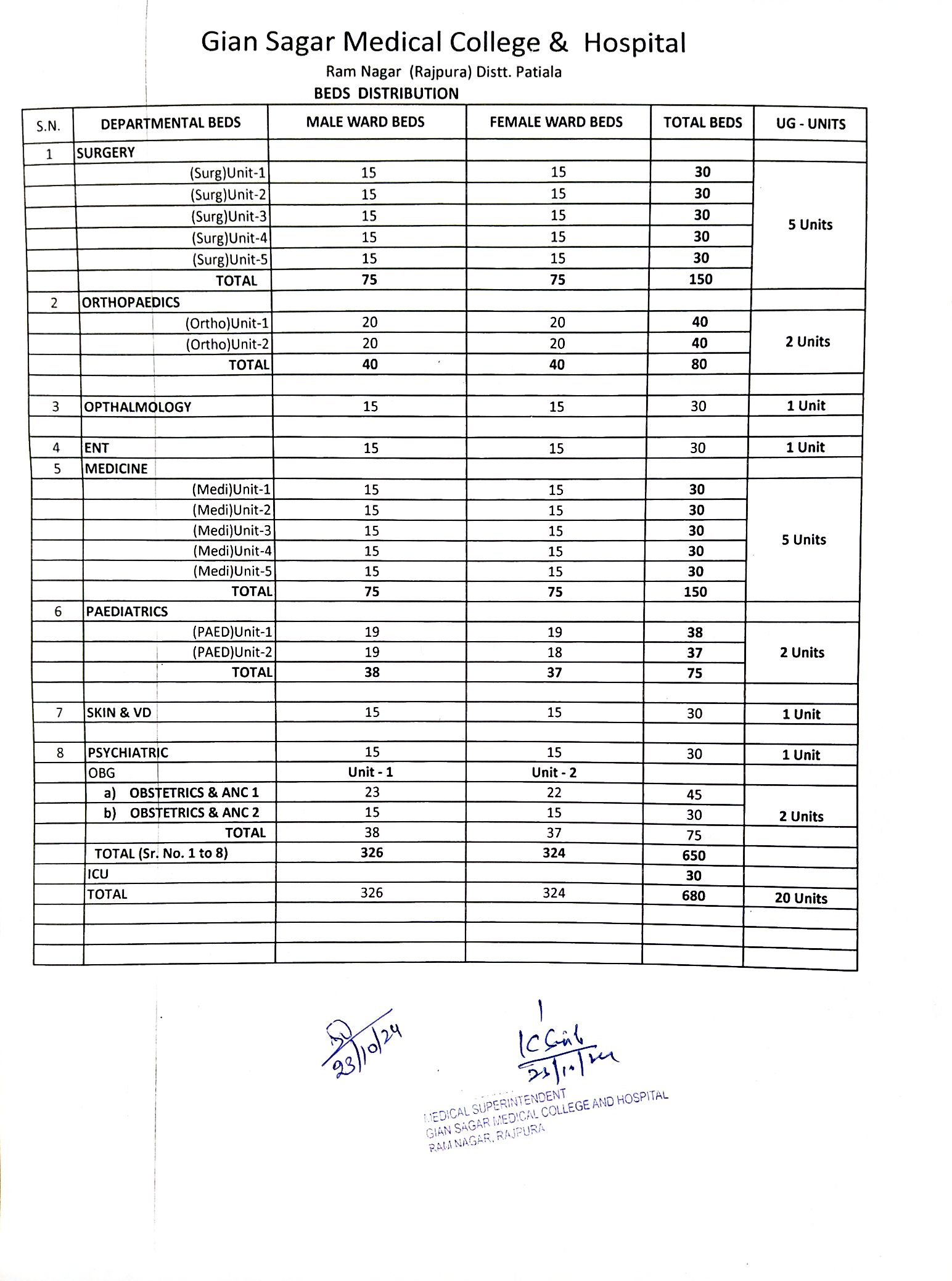 Unit/Department Wise Beds Distribution.